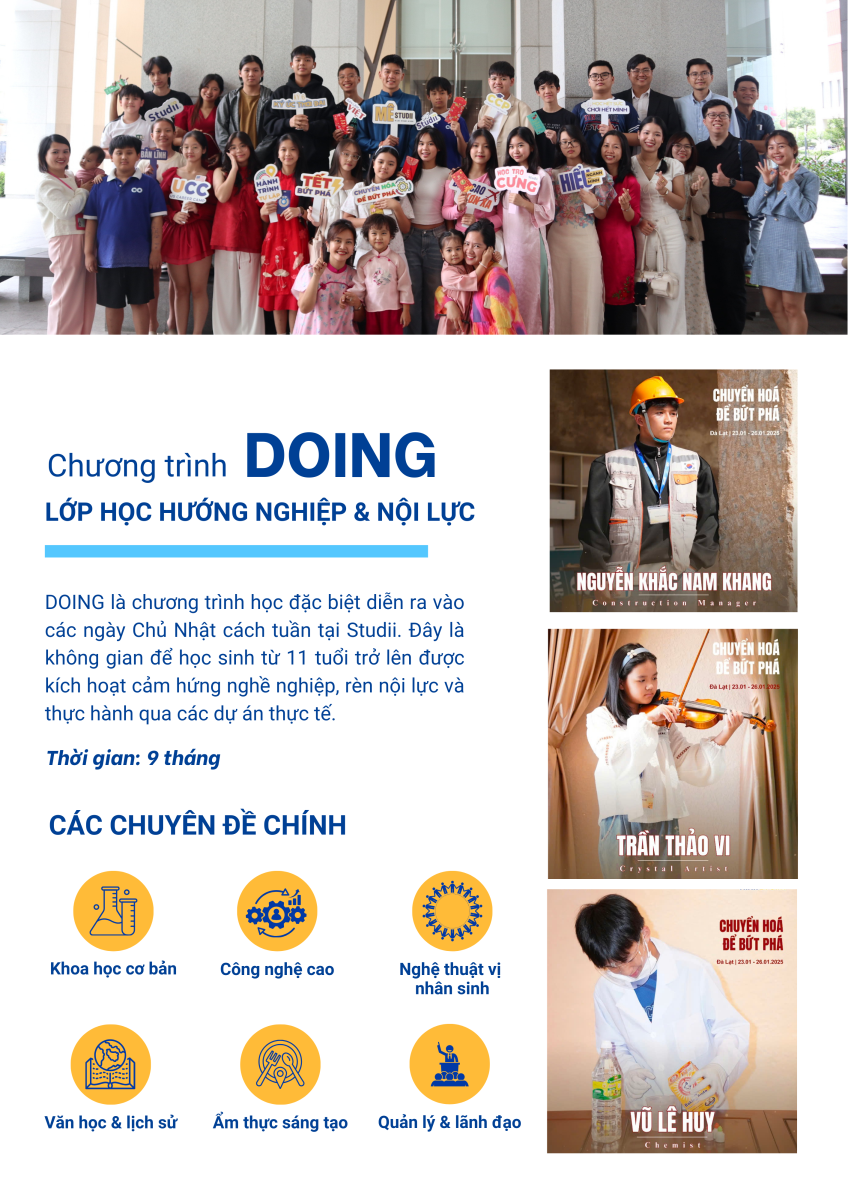 Doing là chương trình được xây dựng dựa trên nền tảng của thông minh cảm xúc và lý thuyết nền tảng về Nội lực do Học viện Studii xây dựng, nghiên cứu và biên soạn. Chương trình nuôi dưỡng sự bền bỉ và vững chãi dành cho các bạn tuổi teen. Doing hướng đến việc con tự định hướng học tập và nghề nghiệp.