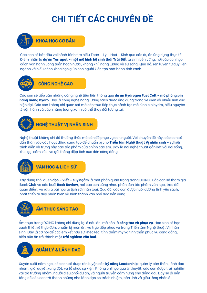 Điểm đặc biệt của Doing nằm ở chương trình được thiết kế theo thang nhận thức Bloom, hướng đến sự phát triển tư duy từ nền tảng đến cấp độ sáng tạo. Đây là bước khởi đầu giúp con tự định hướng học tập và nghề nghiệp cho tương lai