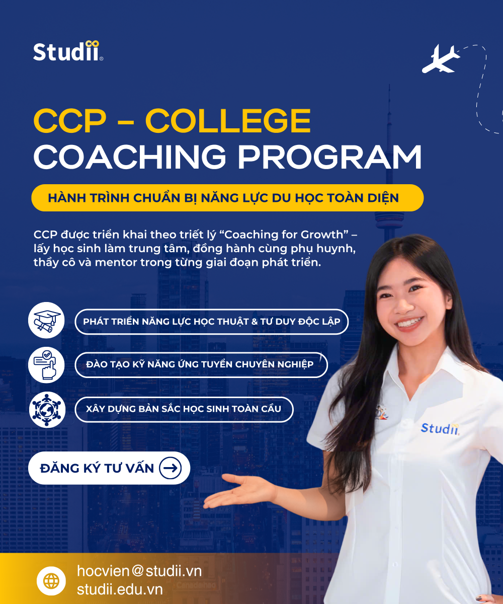 Từ nhận thức đó, đội ngũ Studii thiết kế CCP (College Coaching Program) – chương trình phát triển năng lực và chiến lược du học toàn diện dành cho học sinh trung học đang chuẩn bị chuyển mình sang hành trình học tập quốc tế.