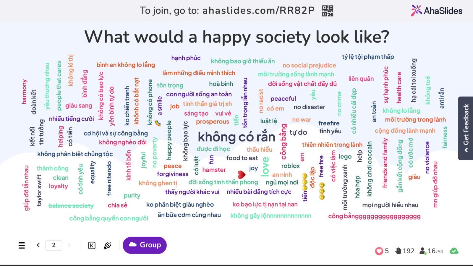 Từ những thảo luận sôi nổi, các con tạo nên wordcloud của riêng mình và tiếp tục học cách thiết kế thí nghiệm để kiểm chứng giả định. Khi tìm hiểu thí nghiệm “Vũ trụ 25”, các con rút ra nhận thức mới: hạnh phúc không bắt nguồn từ sự đầy đủ tuyệt đối, mà được nuôi dưỡng bởi kỷ luật, trách nhiệm và sự chung tay kiến tạo cộng đồng của mỗi cá nhân.